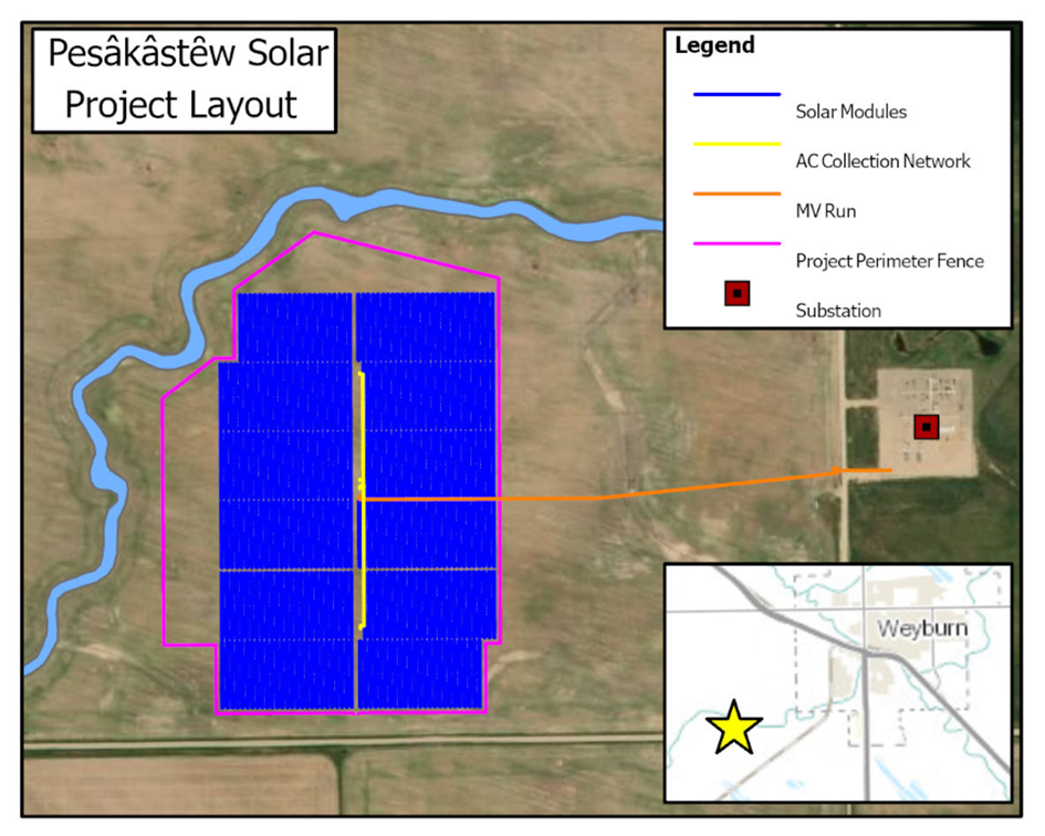 The Pesâkâstêw Solar Project is a 10 MW solar farm in the Rural Municipality of Weyburn, Saskatchewan, approximately 4 km southwest of the city of Weyburn. The project is operational from the summer 2022, supplying clean energy to the Saskatchewan electrical grid.