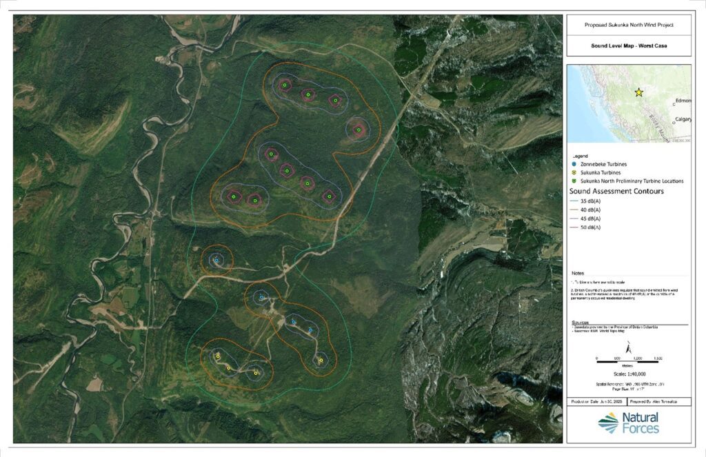 Based on this siting, Natural Forces assessed the impact of the combined sound levels from the proposed Sukunka North Wind Project and the existing neighboring turbines on nearby homes. This assessment uses industry best practices to model how the sound created by the 18 wind turbines will travel over the landscape.