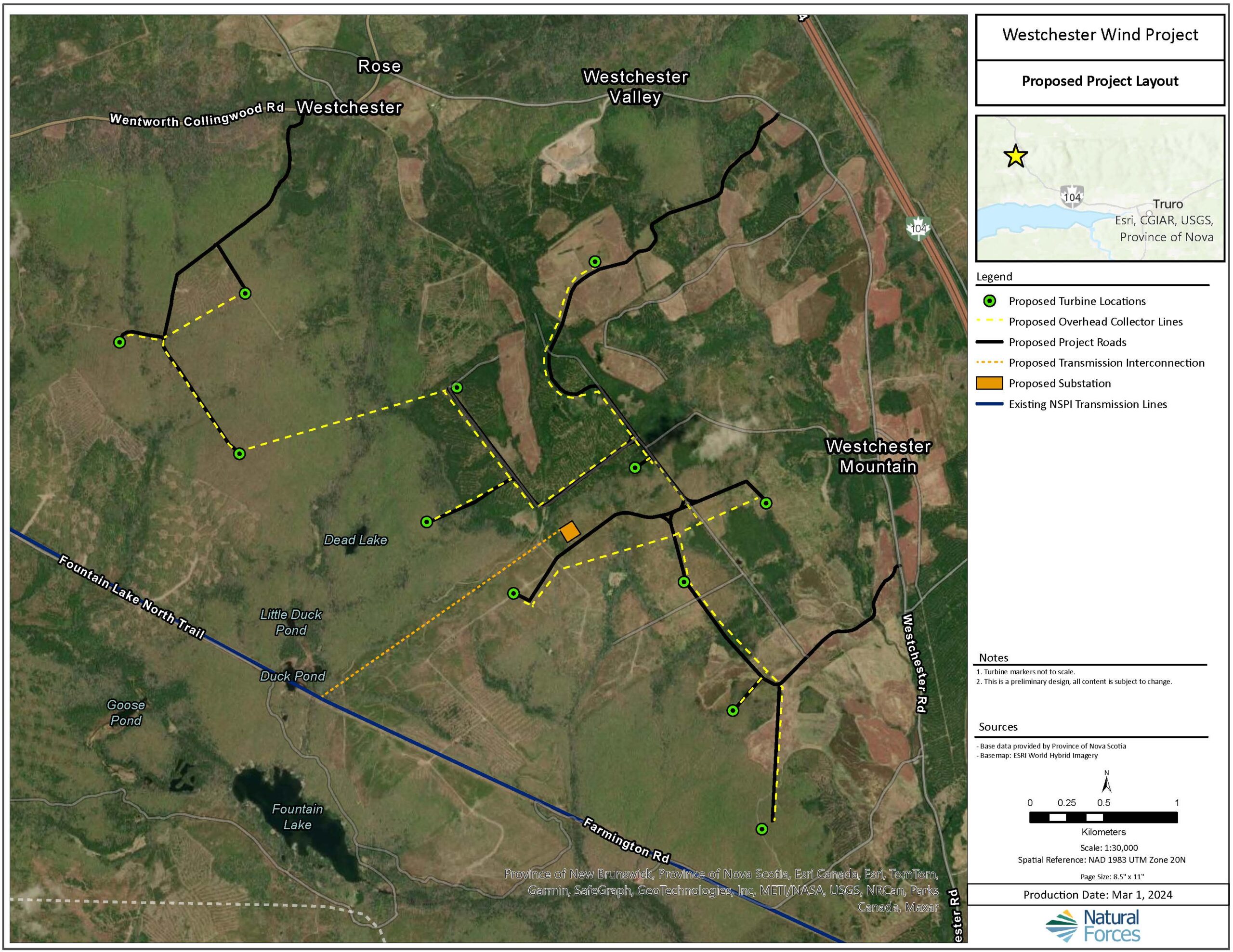 This project is located in Mi’kmaki, the ancestral territory of the Mi’kmaq. Natural Forces acknowledges that working on these lands is a privilege that comes with a great deal of responsibility. We believe that private companies have an important role to play in the decolonization of the energy sector and, ultimately, the path towards reconciliation through partnerships and meaningful engagement. To honour and achieve this, we must look forward for generations and integrate the practices and knowledge of the original land stewards, the Mi’kmaq, into project planning. The proposed Westchester Wind Project is being developed by Natural Forces. Natural Forces, alongside any future partners, will develop, construct, operate, and own the project. The initial plans are for the proposed project to consist of an estimated 12 wind turbines. Depending on which wind turbine generators are deemed most appropriate for the project, these 12 turbines could have a total installed capacity from approximately 50 MW to 84 MW. This would be enough electricity to power over 17,000 Nova Scotian homes. The project is located in Cumberland County, on Westchester Mountain to the west of Highway 104, approximately 24 km from the Cobequid Pass Tolls.